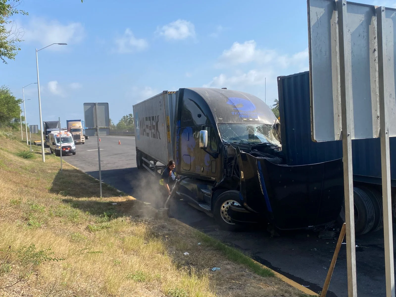 La Unidad Estatal de Protección Civil (UEPC) del Gobierno del Estado de Colima alerta a quienes manejan por la autopista Colima-Manzanillo, pues hay tránsito lento, derivado de un accidente entre dos vehículos de carga pesada.