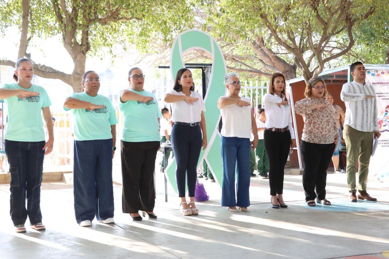 Como parte de estas actividades, se realizó la colocación simbólica de un distintivo verde a integrantes de la escolta, maestros de ceremonia y alumnado, como muestra del compromiso con la protección y promoción de sus derechos. Asimismo, se entregaron trípticos informativos a las y los estudiantes, con el objetivo de reforzar estos conocimientos de manera accesible.