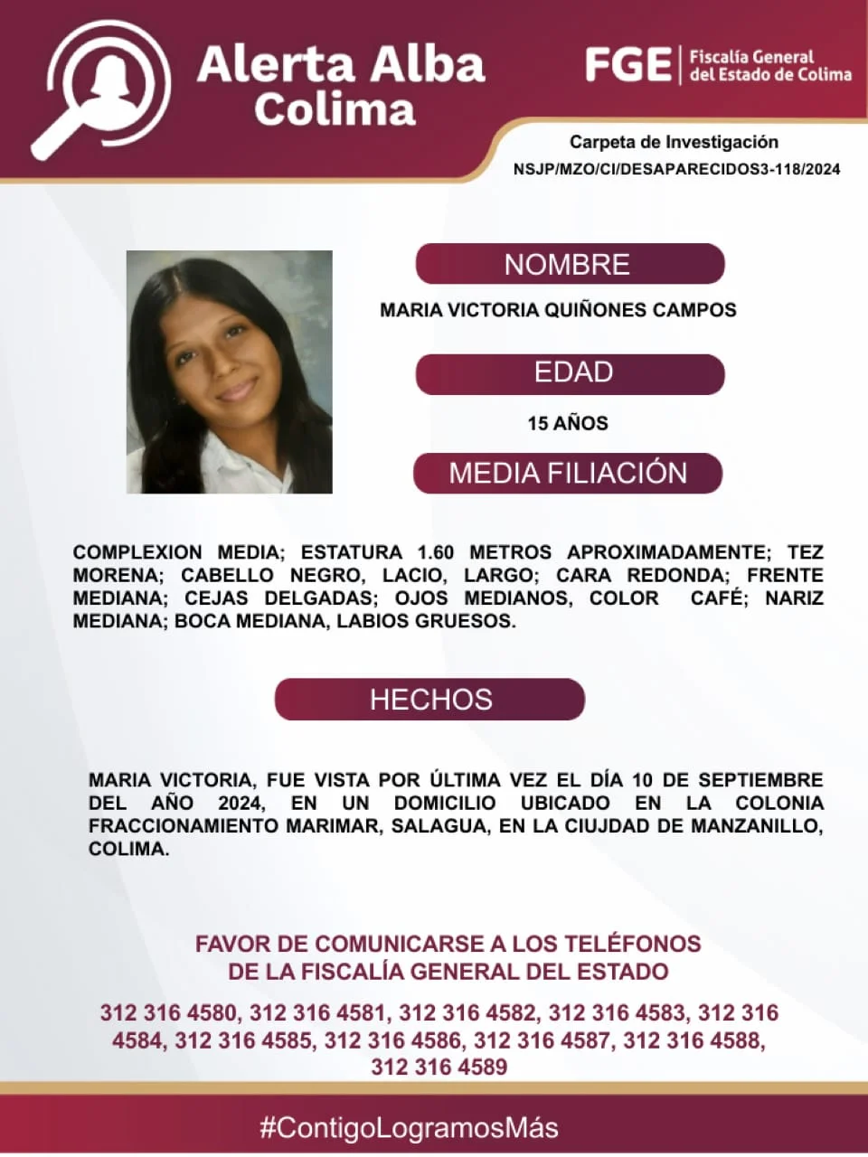 Favor de comunicarse a los teléfonos de la Fiscalía General del Estado. 312 316 45 80, 312 316 45 81, 312 316 45 82, 312 316 45 83, 312 316 45 84, 312 316 45 85, 312 316 45 86, 312 316 45 87, 312 316 45 88, 312 316 45 89