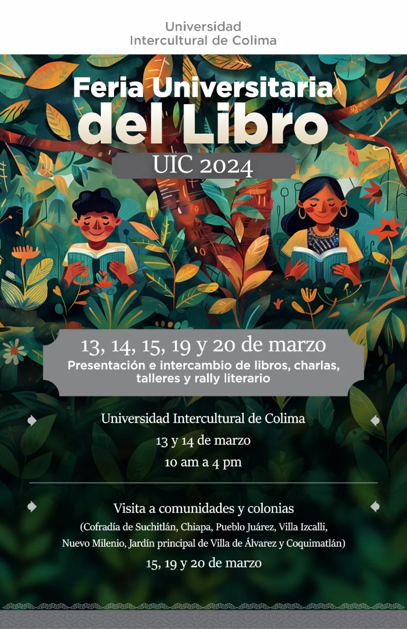 La Universidad Intercultural de Colima (UIC) realiza la ‘Feria Universitaria del Libro’ los días 13, 14, 15, 19 y 20 de marzo, tanto en el campus de esta institución educativa, como en algunas colonias y comunidades de Comala, Colima, Villa de Álvarez, Cuauhtémoc y Coquimatlán, con venta y trueque de ediciones, mercado gastronómico y artesanal, presentación de libros, charlas y diversas actividades literarias y culturales.