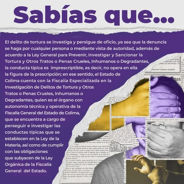 El delito de tortura se investiga y persigue de oficio, ya sea que la denuncia se haga por cualquier persona o mediante vista de autoridad, ademas de acuerdo a la Ley General para Prevenir, investigar y Sancionar la Tortura y otros Tratos de Penas Crueles, Inhumanos o Degradantes, la conducta típica es imprescriptible, es decir, no opera en ella la figura de la prescripción; en ese sentido, el Estado de Colima cuenta con la Fiscalia Especializada en la Investigación de Delitos de Tortura o Otros Tratos de Penas Crueles Inhumanos o Degradantes, quien es el órgano con autonomía técnica y Operativa de la Fiscaía General del Estado de Colima, que se encuentra a cargo de perseguir e investigar las conductas típicas que se establecen en la ley de la materia, así como cumplir con las obligaciones que subyacen de la Ley Orgánica de la Fiscalía General del Estado.
