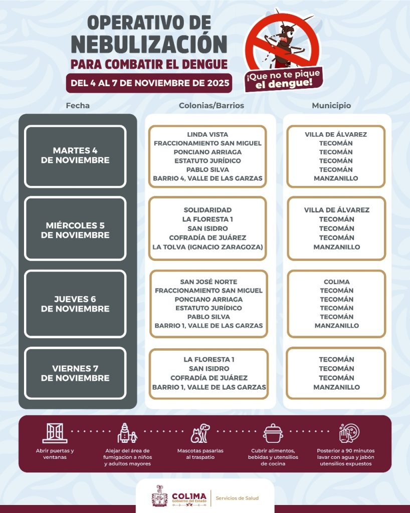 El jueves nebulizará en la colonia San José Norte (Colima), y de nuevo las cuatro colonias de Tecomán que fumiga este martes, además del Barrio 1 del Valle de las Garzas (Manzanillo).