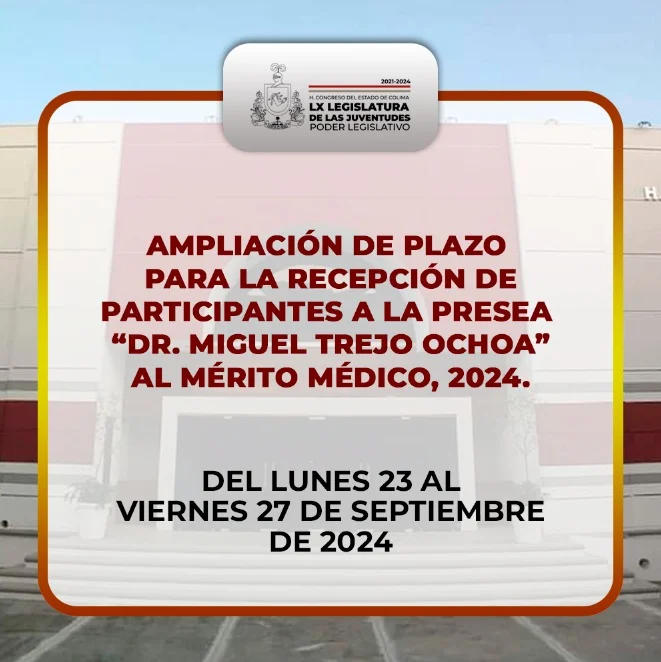 El Honorable Congreso del Estado Libre y Soberano de Colima amplió la convocatoria hecha a los Ayuntamientos de la Entidad, a los Colegios de Profesionistas, Organismos Públicos, Instituciones Públicas, Instituciones Educativas Públicas y Privadas, Asociaciones y Sociedades Civiles, y a la Ciudadanía en General, para inscribir a aquellas personas que tengan una destacada trayectoria y aportaciones en el ámbito médico, merecedoras de la Presea “Dr. Miguel Trejo Ochoa”, en su edición 2024. El plazo para la entrega de propuestas se extiende hasta este viernes 27 de septiembre, de 09:00 a 15:00 horas, en la Secretaría General del H. Congreso del Estado de Colima, ubicada en Calzada Pedro A. Galván, esquina con calle Los Regalado S/N, Zona Centro, de Colima, Colima.