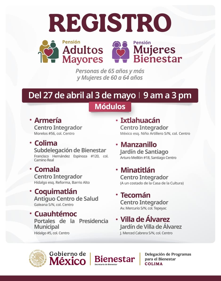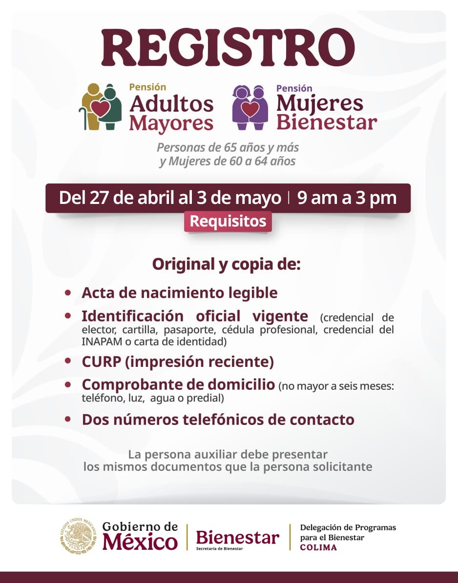 La secretaria de Bienestar, Ariadna Montiel Reyes, informó que del 27 de abril al 3 de mayo se realiza a nivel nacional el registro a la Pensión para el Bienestar de las Personas Adultas Mayores de 65 años o más y a Pensión Mujeres Bienestar dirigido a mexicanas de 60 a 64 años que les reconoce toda una vida de trabajo y esfuerzo en el cuidado de sus familias.