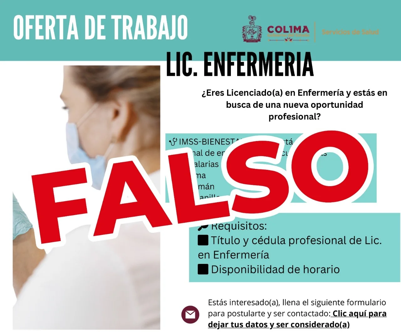 La Secretaría de Salud del Gobierno del Estado de Colima hace del conocimiento y alerta a la ciudadanía sobre la información contenida en una imagen que circula en redes sociales que es falsa y desmiente categóricamente que el programa IMSS-Bienestar esté realizando contrataciones de personal de enfermería, bajo las dinámicas descritas en dicha publicación.
