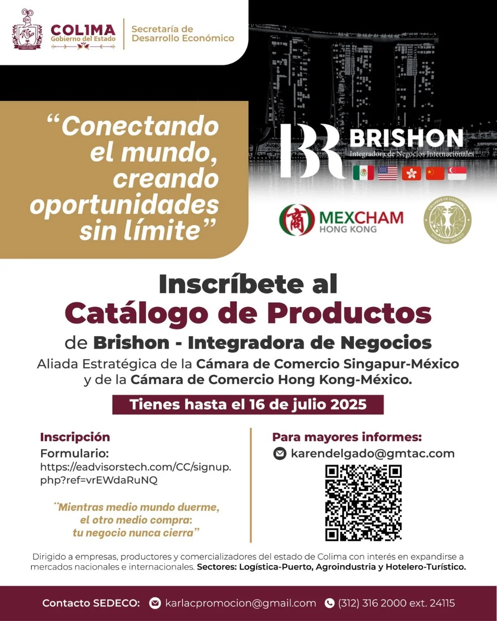 La Secretaría de Desarrollo Económico (Sedeco) del Gobierno del Estado de Colima invita a las empresas locales a participar en el Catálogo de Productos de Brishon – Integradora de Negocios Internacionales, plataforma estratégica que promueve la vinculación comercial con compradores de Asia y otras regiones del mundo.