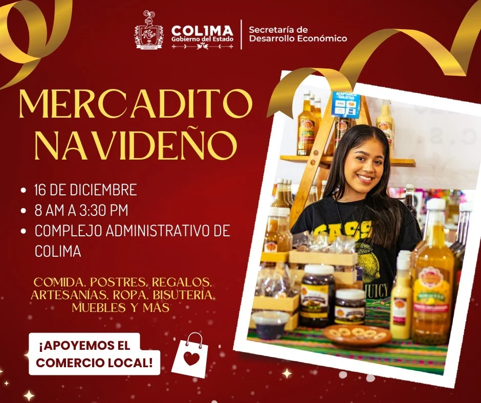 La Secretaría de Desarrollo Económico (Sedeco) del Gobierno del Estado de Colima invita a todo el público a asistir y consumir en el ‘Mercadito Navideño 2024’ el próximo lunes 16 de diciembre de las 8:00 de la mañana a las 3:00 de la tarde en la explanada del Complejo Administrativo, por Tercer Anillo Periférico y Libramiento Ejército Mexicano en el municipio capitalino, donde habrá venta de productos locales, artesanías colimenses, gastronomía típica de la región y mucho más.