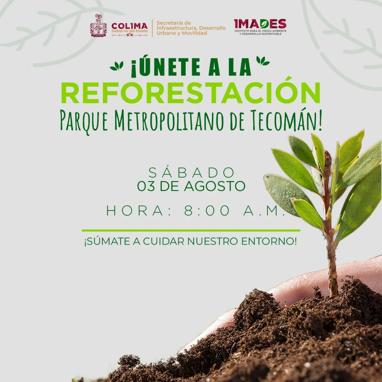 El Gobierno del Estado de Colima, a través de la Secretaría de Infraestructura, Desarrollo Urbano y Movilidad, (Seidum), en colaboración con el Instituto de Medio Ambiente para el Desarrollo Sustentable (Imades), invitan a toda la población a participar en la jornada de reforestación, este sábado 3 de agosto a partir de las 8:00 de la mañana, en el Parque Metropolitano de Tecomán.