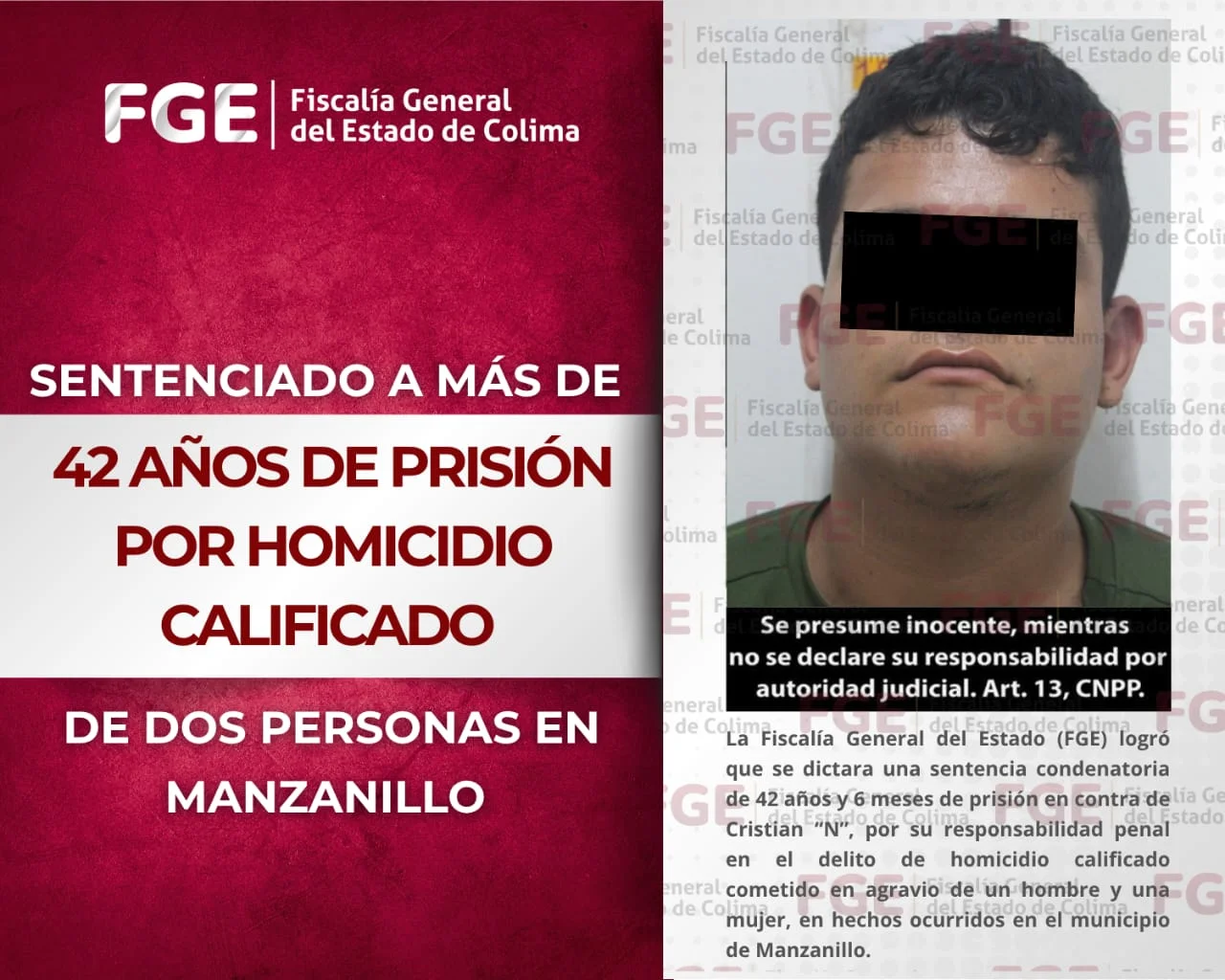 La Fiscalía General del Estado (FGE) logró que se dictara una sentencia condenatoria de 42 años y 6 meses de prisión en contra de Cristian “N”, por su responsabilidad penal en el delito de homicidio calificado cometido en agravio de un hombre y una mujer, en hechos ocurridos en el municipio de Manzanillo.