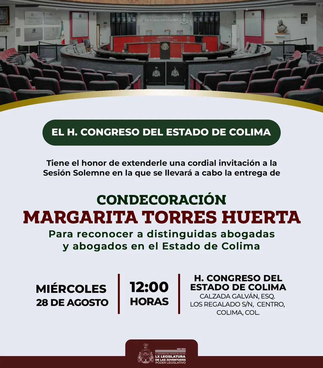 #Invitación | La LX Legislatura de este Poder Legislativo tiene el honor de extender la cordial invitación a la Sesión solemne con motivo de la entrega de la Condecoración “Margarita Torres Huerta”, para reconocer a distinguidas abogadas y abogados en el Estado de Colima, que se llevará a cabo el miércoles 28 de agosto a las 12:00 horas en el Pleno del H Congreso del Estado de Colima.