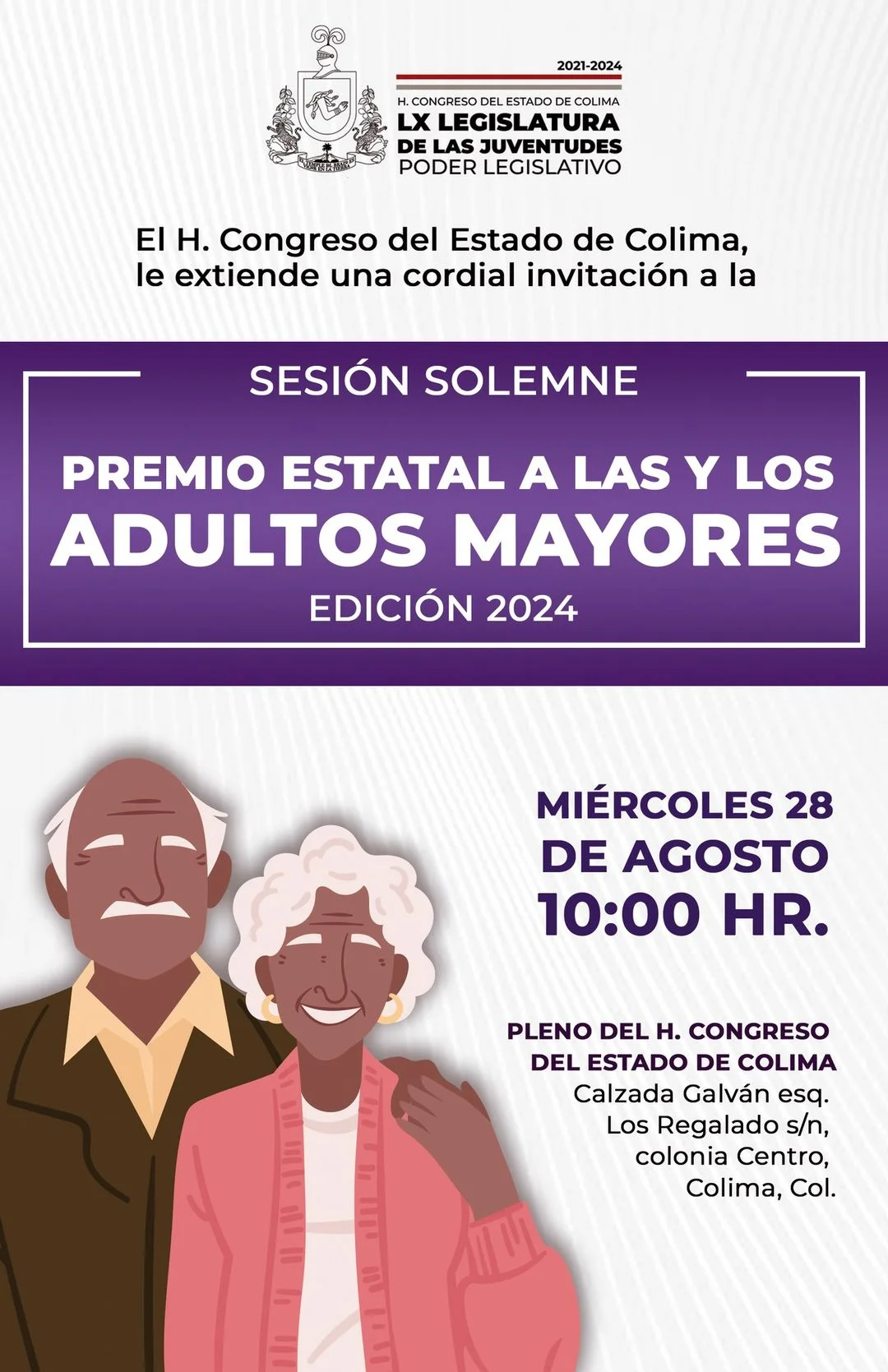 #Invitación | El H Congreso del Estado de Colima extiende una cordial invitación a la próxima Sesión Solemne en el marco de la entrega del Premio Estatal a las y los Adultos Mayores en su edición 2024, que se llevará a cabo el miércoles 28 de agosto a las 10:00 horas en el Recinto Legislativo.