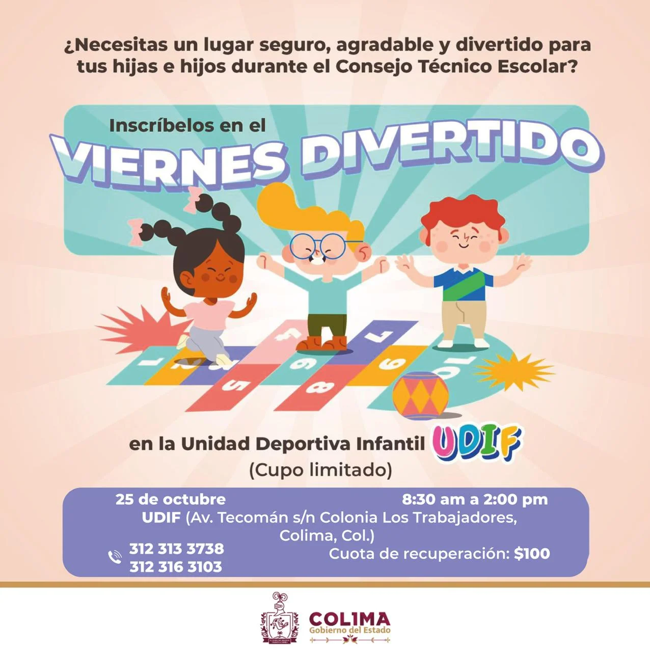 El Gobierno del Estado de Colima, a través del DIF Estatal, informa que el registro para el programa ‘Viernes Divertido en la UDIF’ continúa abierto. Este programa se realizará este viernes 25 de octubre y está dirigido a niñas, niños y adolescentes de 4 a 14 años que viven en la zona conurbada de Colima y Villa de Álvarez, y que no tendrán clases ese día, debido a los Consejos Técnicos programados por la Secretaría de Educación y Cultura.