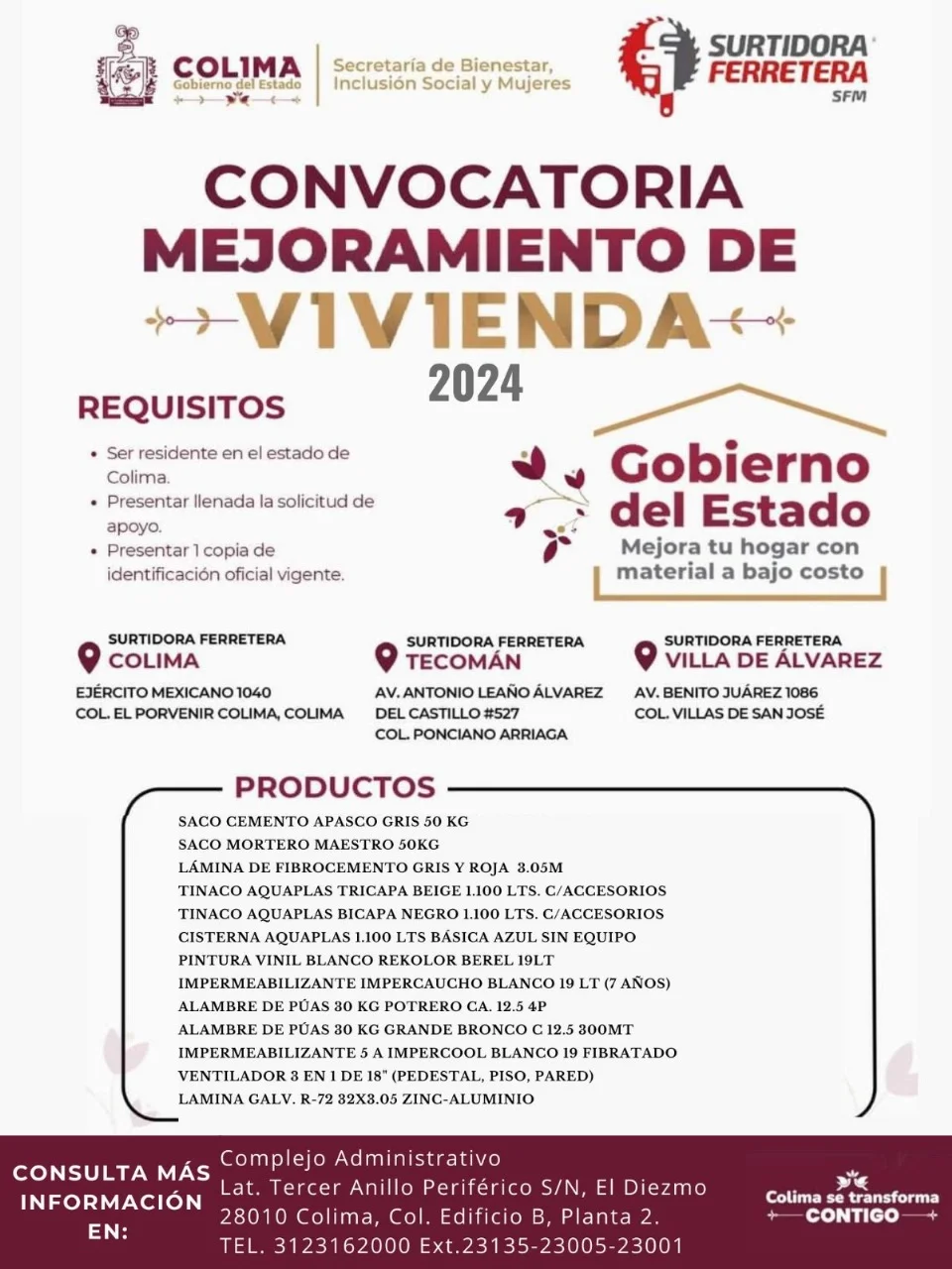 La convocatoria, que cierra el 15 de octubre próximo, beneficia a residentes del estado de Colima, que sean mayores de edad y necesiten materiales para construcción; sus solicitudes se reciben en las oficinas de la Sebiinsom en Colima y Tecomán, donde se debe llenar formato foliado que deberán presentar directamente en alguna de las tres sucursales de la Surtidora Ferretera, ubicadas en Colima, Tecomán y Villa de Álvarez.