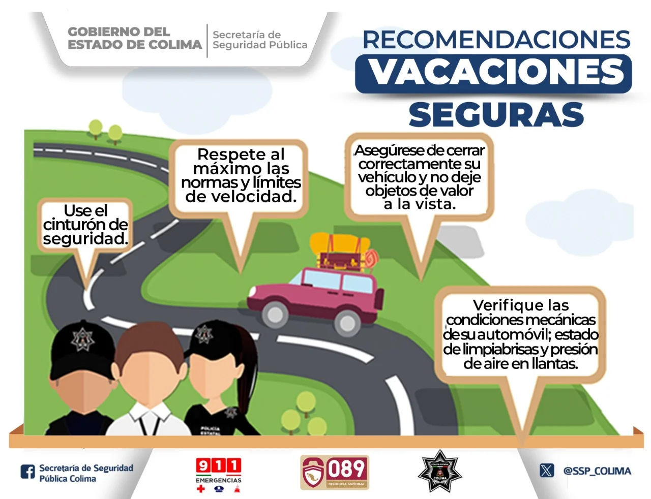 Con motivo de este próximo periodo vacacional de Semana Santa y Pascua, la Secretaría de Seguridad Pública hace un llamado a la población colimense para atender las siguientes recomendaciones que deben de considerar si van a salir de viaje, con el objetivo de tener un feliz retorno a casa, en compañía de familiares y seres queridos.