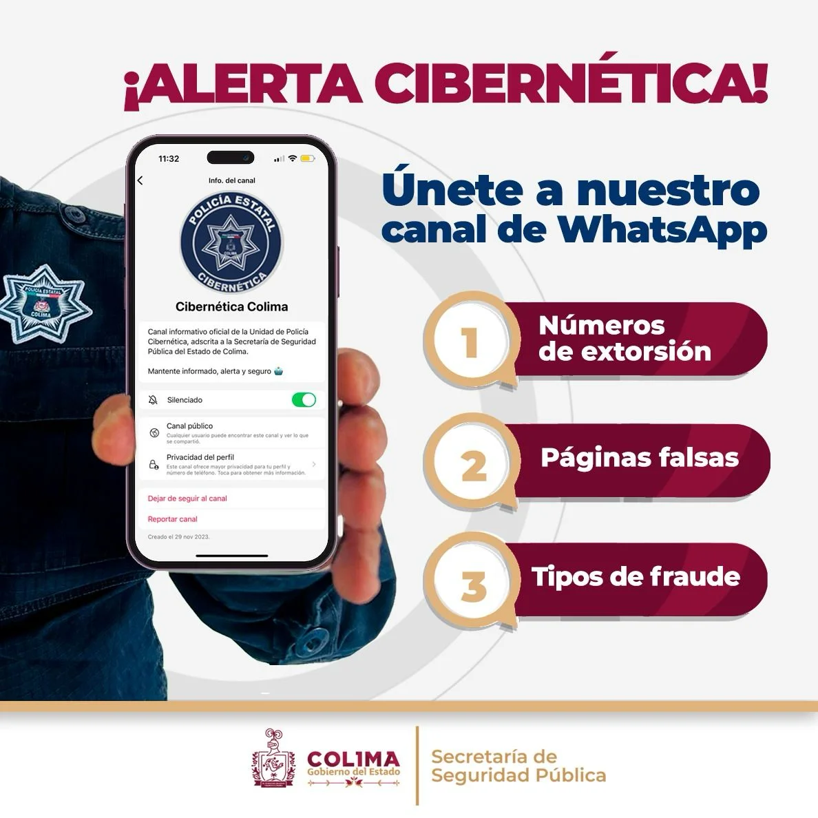 La Secretaría de Seguridad Pública (SSP) del Gobierno del Estado de Colima invita a toda la población de la entidad a suscribirse -de manera gratuita- al canal de difusión de la Policía Cibernética Colima a través de https://whatsapp.com/channel/0029VaAyyCiATRSi23tsju3T en WhatsApp.