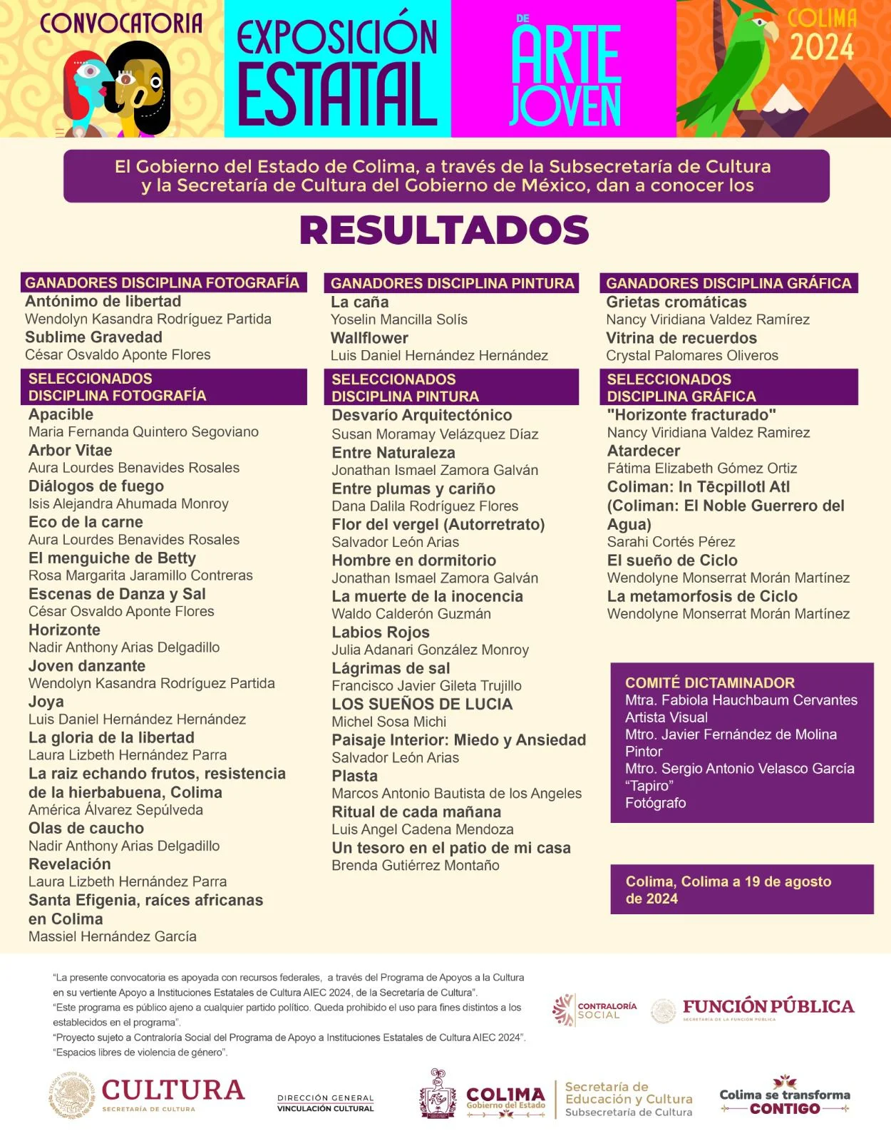 Un total de 38 obras de artistas visuales conformarán la Exposición Estatal de Arte Joven Colima 2024, y se trata de 16 series fotográficas, 15 pinturas y 7 obras gráficas, dio a conocer la Subsecretaría de Cultura del Gobierno del Estado, tras hacer pública la lista de resultados de la convocatoria para integrar esta muestra, que próximamente estará abierta al público.
