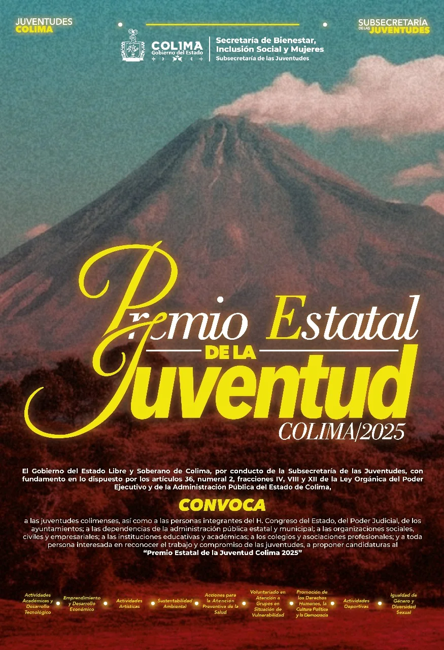 La Subsecretaría de las Juventudes (Subsejuv) del Gobierno del Estado de Colima da a conocer la convocatoria al Premio Estatal de la Juventud 2025, que estará abierta del 14 de julio al 22 de agosto, para postular jóvenes colimenses que destaquen en diversas áreas, reconociéndolos en dos categorías: de 12 a 17 años y de 18 a 29 años de edad.