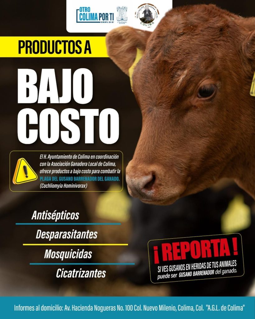 Ante la presencia del gusano barrenador, el H. Ayuntamiento de Colima y la Asociación Ganadera Local de Colima ponen a tu alcance productos a bajo costo: