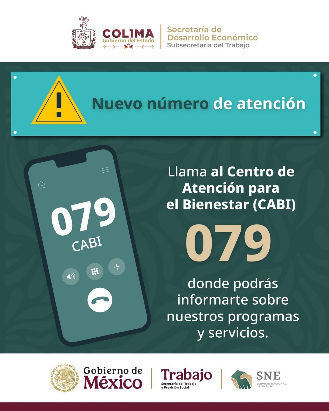 La Subsecretaría del Trabajo del Gobierno del Estado de Colima invita a la población a comunicarse al Centro de Atención para el Bienestar (CABI) en el número telefónico 079, servicio gratuito disponible las 24 horas del día, los 365 días del año, que brinda orientación sobre trámites, servicios y programas sociales del Gobierno de México y facilita a la ciudadanía el acceso a información y atención confiable mediante procesos estandarizados.