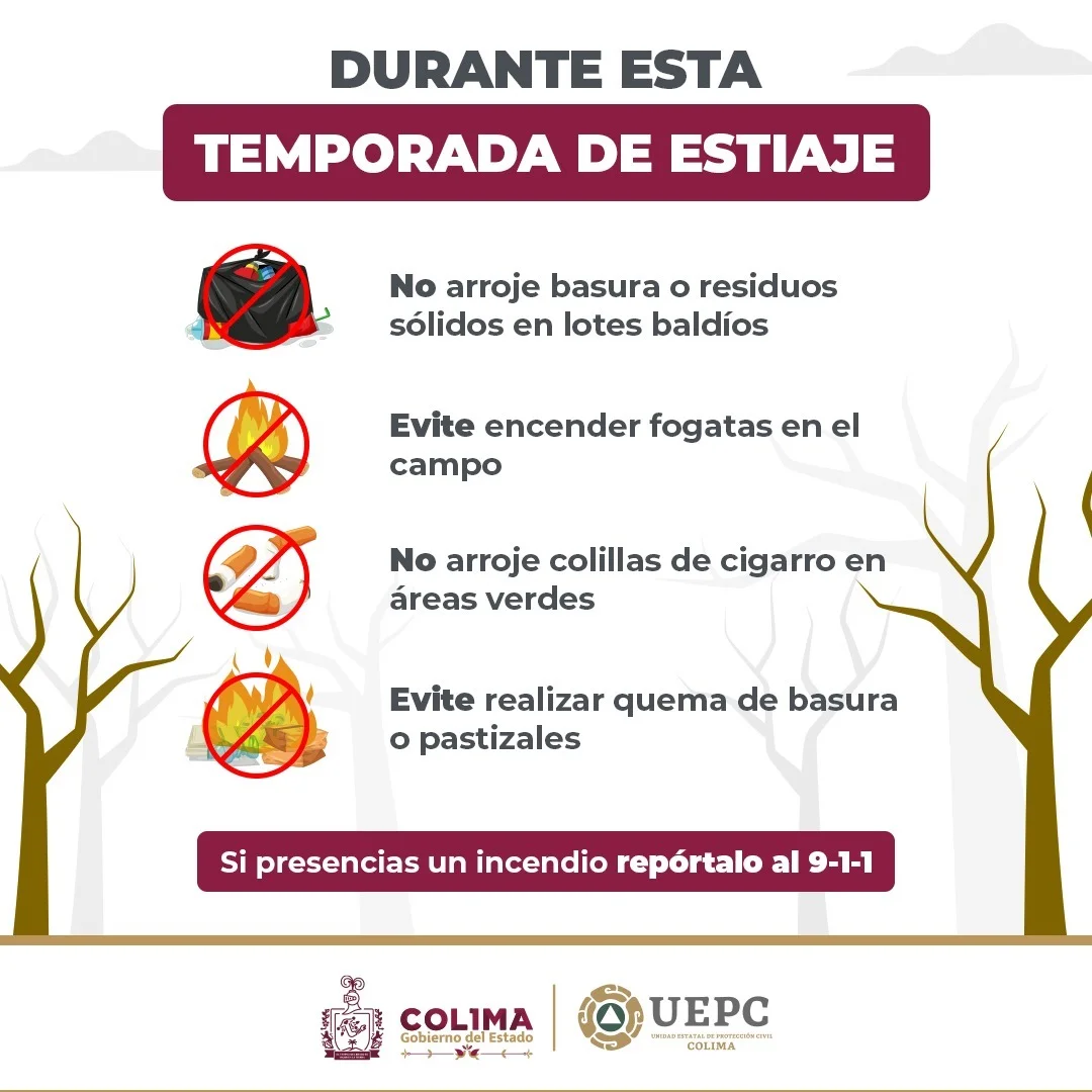 La Unidad Estatal de Protección Civil (UEPC) del Gobierno del Estado de Colima, hace un llamado a toda la población para evitar acciones que puedan ocasionar incendios forestales y urbanos durante todo el año, pero de manera más consciente en la temporada de estiaje.