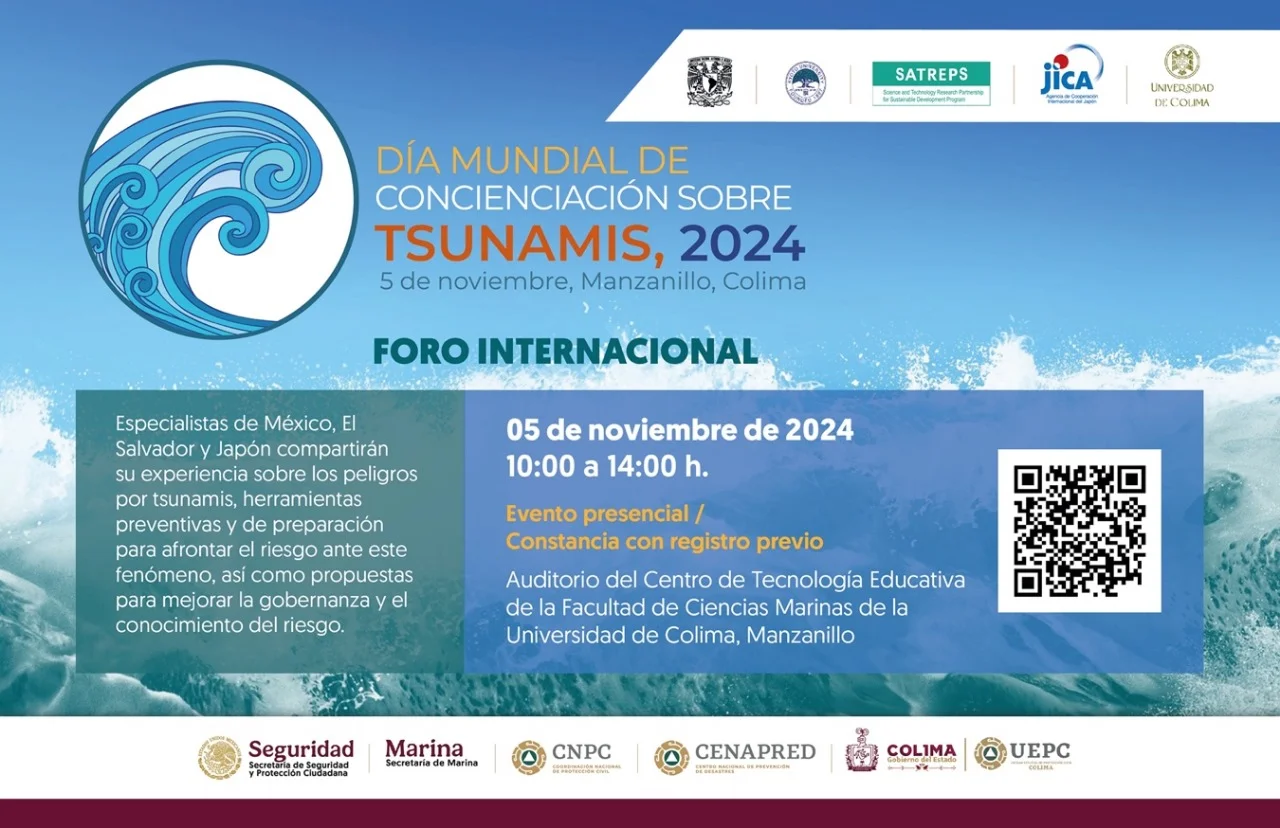 La Unidad Estatal de Protección Civil (UEPC) del Gobierno del Estado de Colima invita a la población en general, estudiantes, sector académico y de investigación, así como a personal de prevención y atención de emergencias, para participar en el Foro Internacional con motivo del Día Mundial de Concienciación de Tsunamis 2024.