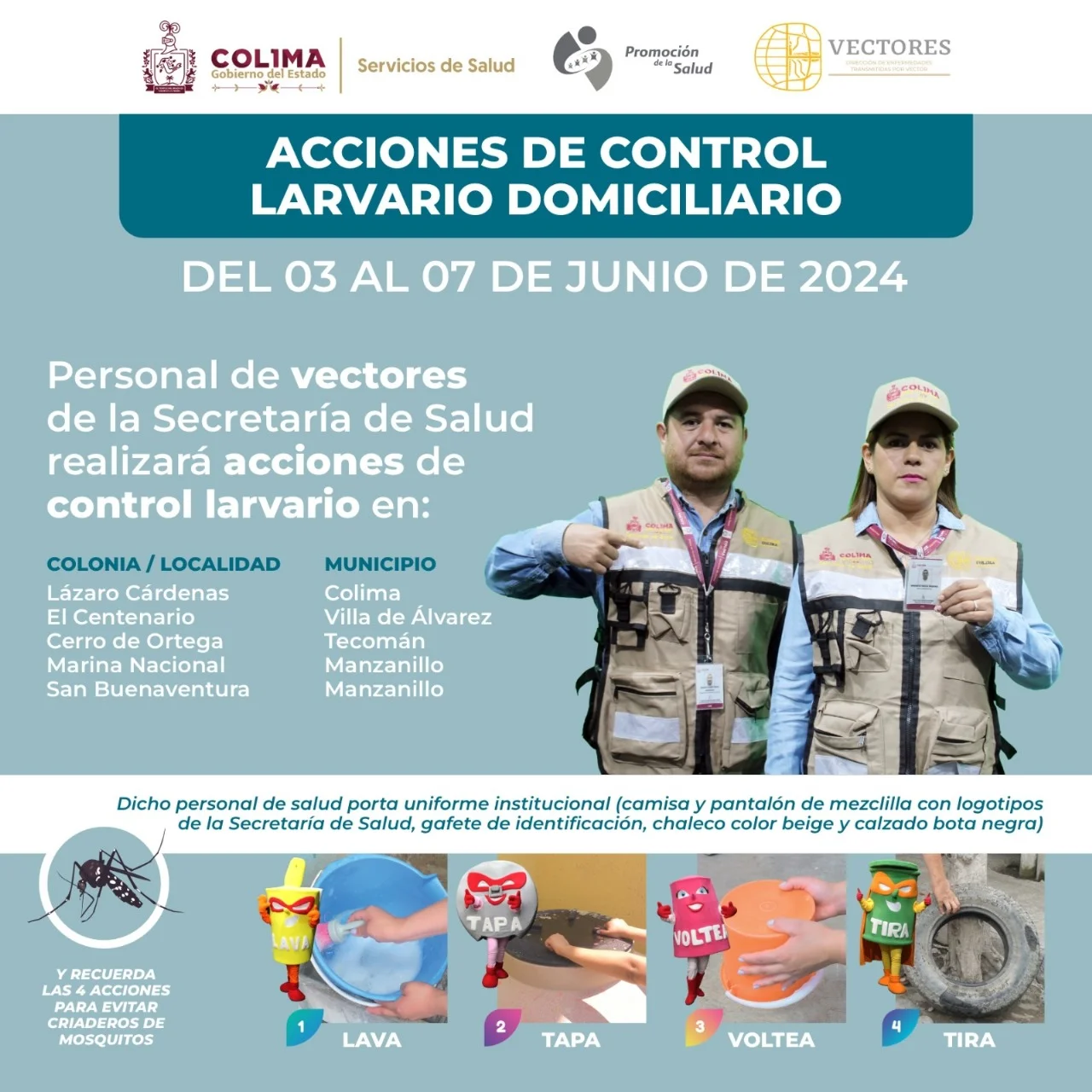 Como parte del reforzamiento a las acciones de combate al dengue, zika y chikungunya para proteger la salud de la población en el estado de Colima, personal de Vectores de la Secretaría de Salud seguirá realizando acciones de control larvario del lunes 3 al viernes 7 de junio, en viviendas e inmuebles de cinco colonias en los municipios de Colima, Villa de Álvarez, Tecomán y Manzanillo.