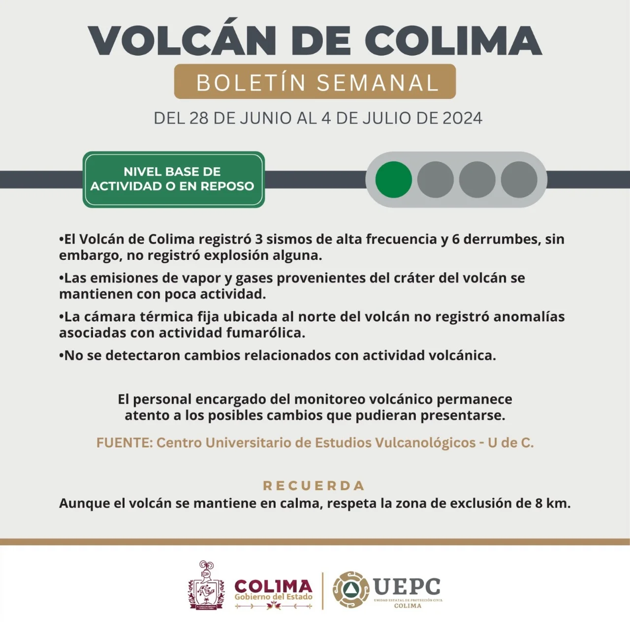 La UEPC destacó que, aunque el Volcán de Colima permanece en ‘semáforo verde’, por seguridad de la población colimense y turistas que visitan nuestro estado, la zona de exclusión sigue siendo de ocho kilómetros en torno al edificio volcánico.