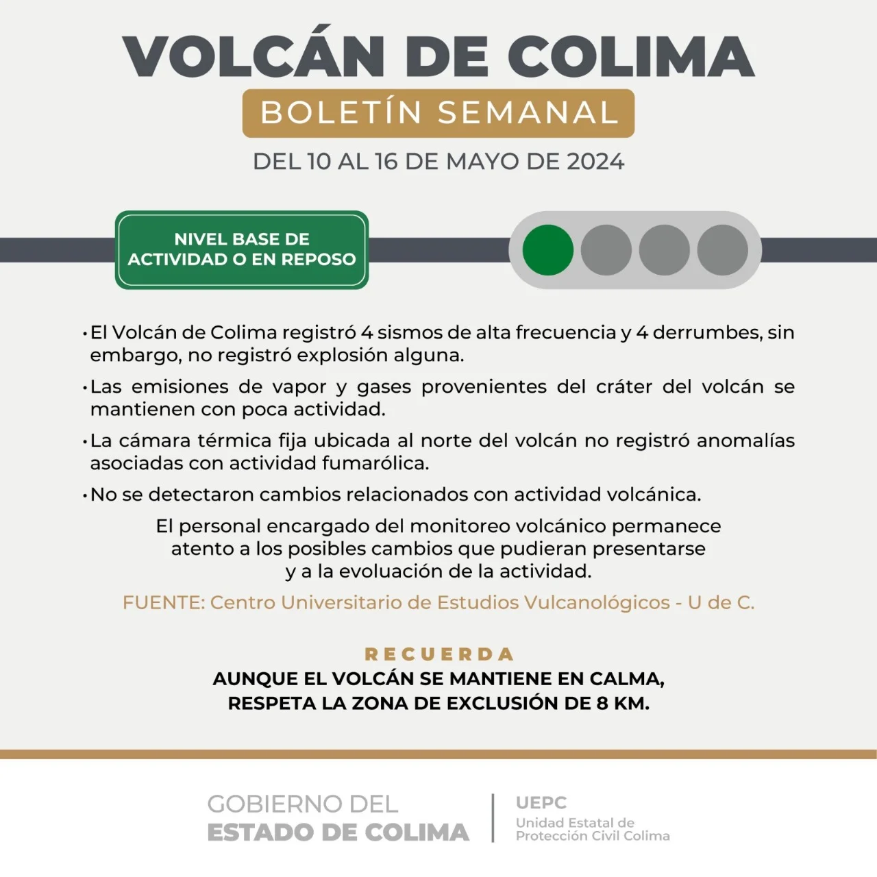 La UEPC destacó que, aunque el Volcán de Colima permanece en semáforo verde, por seguridad de las y los colimenses y turistas que visitan nuestro estado, la zona de exclusión sigue siendo de ocho kilómetros en torno al edificio volcánico.