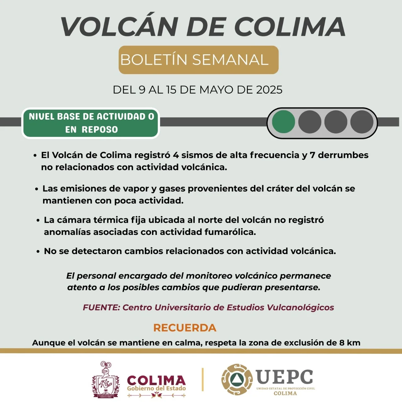 Los parámetros de monitoreo realizados por personal del Centro Universitario de Estudios Vulcanológicos (CUEV) de la Universidad de Colima, indican que durante la semana anterior contabilizaron de forma manual cuatro sismos de alta frecuencia y siete derrumbes, ninguno relacionado con actividad volcánica y fumarólica; también se descartaron explosiones y/o anomalías térmicas, aunque el volcán permanece en calma, la zona de exclusión que se mantiene es de ocho kilómetros en torno al edificio volcánico.
