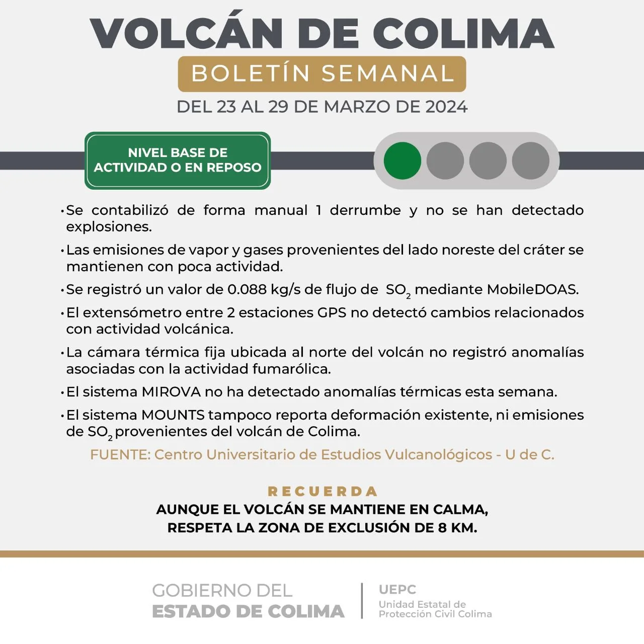 Aunque el semáforo del Volcán de Colima permanece en color verde, la UEPC reiteró que la zona de exclusión es de ocho kilómetros, por lo que se exhorta a respetar esta delimitación, para evitar situaciones de emergencia, dado que está considerado como un volcán activo.